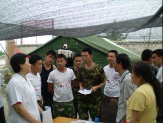 童医师在救灾现场和武警人员、志愿者交流